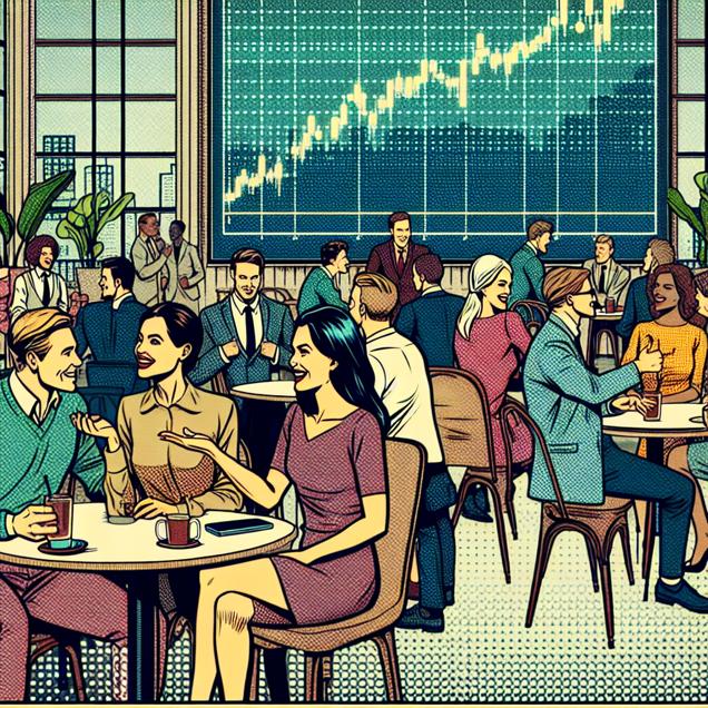 Prompt: Create a comic-book-style illustration with muted colors and a dotted halftone pattern from the 1960s. Depict a group of friends gathering in a lively café, chatting and laughing. One of them, named Mckenzie, sits at the center of the group, surrounded by the joyful chatter. Meanwhile, portray a large screen in the background showing the Vodafone Group's stock price graph steadily climbing upwards, indicating a positive trend. Keep the visual depiction simple without any words or speech bubbles. The depiction should include only scenes, people, and objects, it should not include text or speech bubbles.