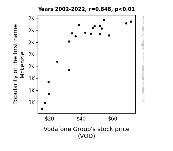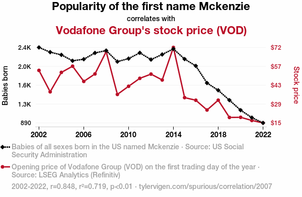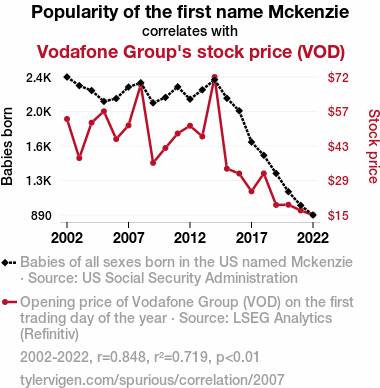 - The spurious research paper: McKenzie Mania and Market Swings: Unraveling the Curious Connection between the Popularity of the Name Mckenzie and Vodafone Group's Stock Price