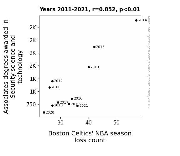 This means 72.5% of the change in the one variable (i.e., Boston Celtics' NBA season loss count) is predictable based on the change in the other (i.e., Associates degrees awarded in Security science and technology) over the 11 years from 2011 through 2021.