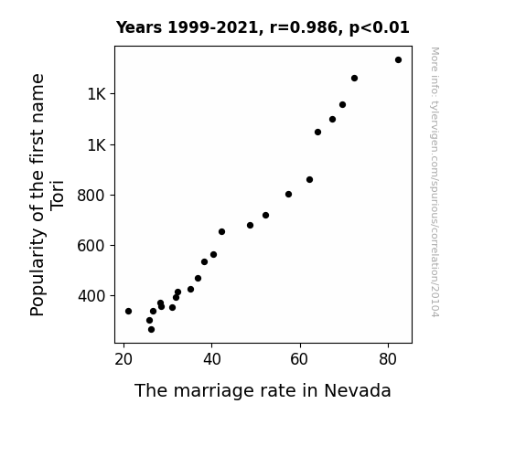 This means 97.2% of the change in the one variable (i.e., The marriage rate in Nevada) is predictable based on the change in the other (i.e., Popularity of the first name Tori) over the 23 years from 1999 through 2021.