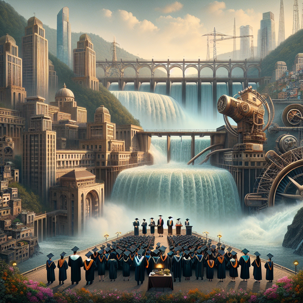 ChatGPT: In a bustling Vietnamese city, we see a university proudly conferring Master's degrees in Engineering technologies to a group of graduates. In the background, a grand hydroelectric dam stands tall and majestic, harnessing the power of rushing water to generate clean and abundant hydropower energy for the nation.