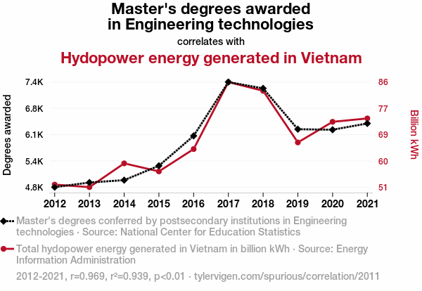 This means 93.9% of the change in the one variable (i.e., Hydopower energy generated in Vietnam) is predictable based on the change in the other (i.e., Master's degrees awarded in Engineering technologies) over the 10 years from 2012 through 2021.