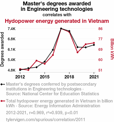 User prompt: Please provide potential search keywords for a paper titled Reaching New Heights: The Current Flow of Master's Degrees in Engineering Technologies and Hydropower Generation in Vietnam with an abstract of In this paper, we delve into the intriguing relationship between the number of Master's degrees awarded in Engineering technologies and the hydropower energy generated in the picturesque landscapes of Vietnam. Our research team utilized data from the National Center for Education Statistics and the Energy Information Administration to investigate this thought-provoking topic. The correlation coefficient of 0.9692557 and a significant p-value of less than 0.01 for the years 2012 to 2021 revealed a strong and statistically meaningful connection.