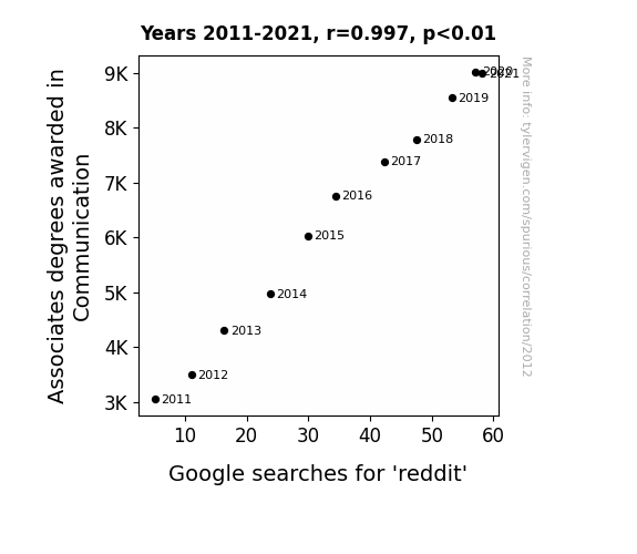 User prompt: Please make up a funny explanation for how an increase in Associates degrees awarded in Communication caused reddit (Google searches for 'reddit') to increase.