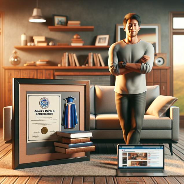 ChatGPT: In a cozy living room, a person holding their Associate's degree in Communication proudly displays it on the wall. Meanwhile, a laptop on the coffee table shows a Google search for "reddit" as the person looks for online communication and networking opportunities.