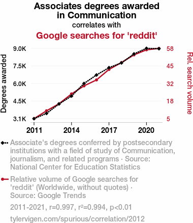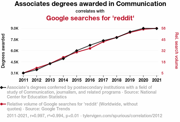 User prompt: Please make up a funny explanation for how an increase in Associates degrees awarded in Communication caused reddit (Google searches for 'reddit') to increase.