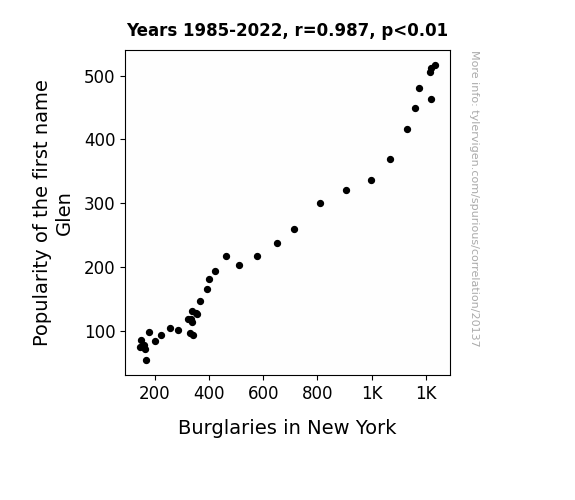 This means 97.5% of the change in the one variable (i.e., Burglaries in New York) is predictable based on the change in the other (i.e., Popularity of the first name Glen) over the 38 years from 1985 through 2022.