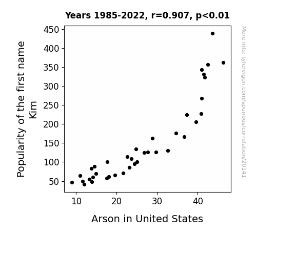This means 82.3% of the change in the one variable (i.e., Arson in United States) is predictable based on the change in the other (i.e., Popularity of the first name Kim) over the 38 years from 1985 through 2022.