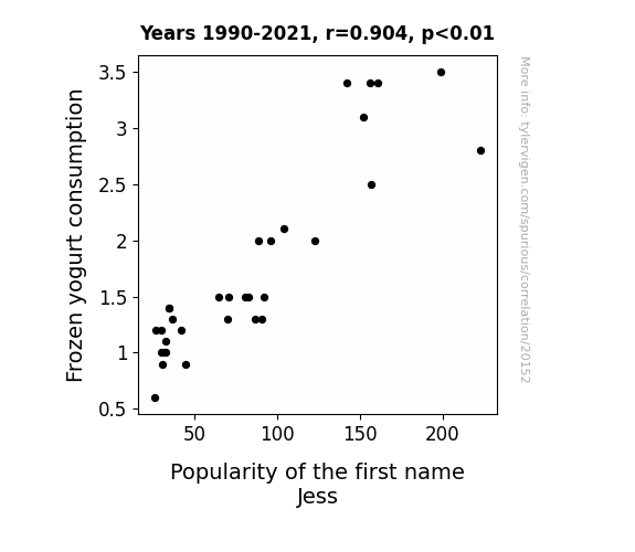 This means 81.7% of the change in the one variable (i.e., Popularity of the first name Jess) is predictable based on the change in the other (i.e., Frozen yogurt consumption) over the 32 years from 1990 through 2021.