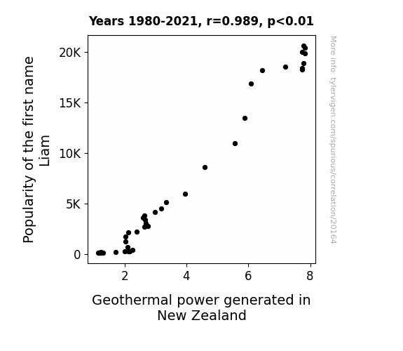 This means 97.8% of the change in the one variable (i.e., Geothermal power generated in New Zealand) is predictable based on the change in the other (i.e., Popularity of the first name Liam) over the 42 years from 1980 through 2021.