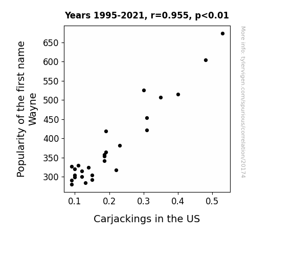 This means 91.3% of the change in the one variable (i.e., Carjackings in the US) is predictable based on the change in the other (i.e., Popularity of the first name Wayne) over the 27 years from 1995 through 2021.