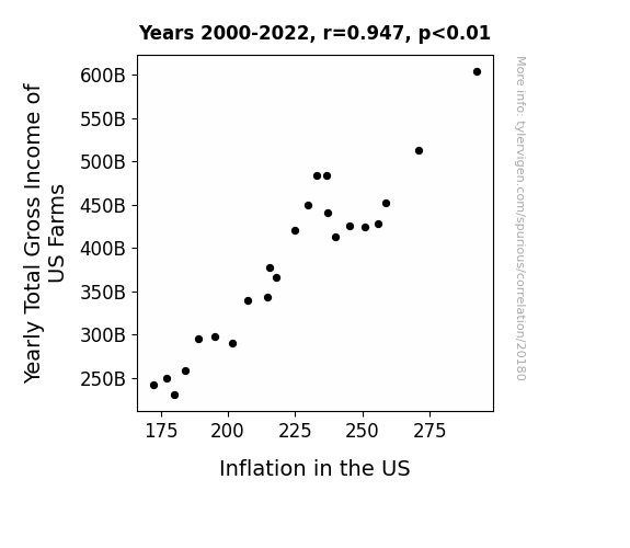 This means 89.8% of the change in the one variable (i.e., Inflation in the US) is predictable based on the change in the other (i.e., Yearly Total Gross Income of US Farms) over the 23 years from 2000 through 2022.