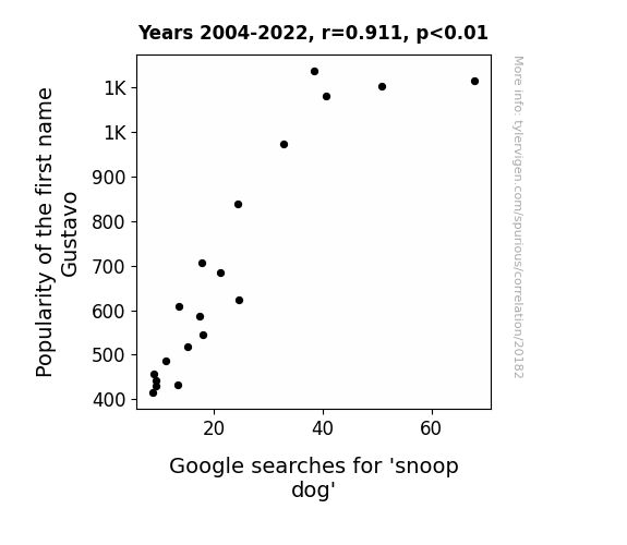 This means 83% of the change in the one variable (i.e., Google searches for 'snoop dog') is predictable based on the change in the other (i.e., Popularity of the first name Gustavo) over the 19 years from 2004 through 2022.
