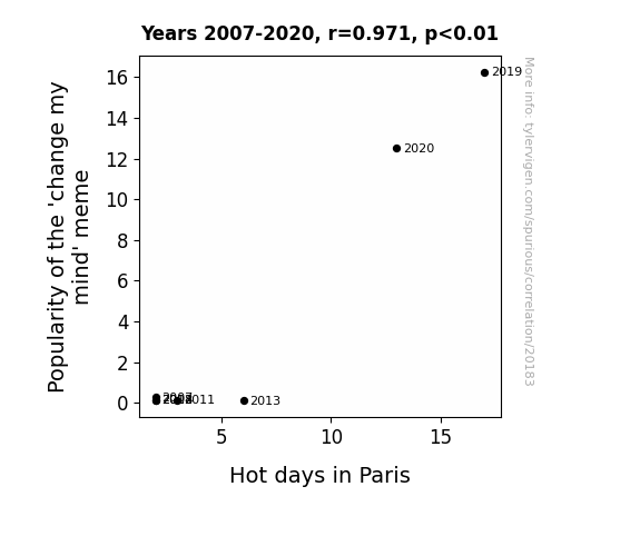 This means 94.3% of the change in the one variable (i.e., Hot days in Paris) is predictable based on the change in the other (i.e., Popularity of the 'change my mind' meme) over the 7 years from 2007 through 2020.