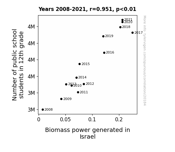 This means 90.5% of the change in the one variable (i.e., Biomass power generated in Israel) is predictable based on the change in the other (i.e., Number of public school students in 12th grade) over the 14 years from 2008 through 2021.
