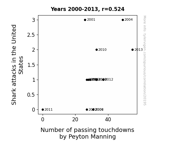This means 27.5% of the change in the one variable (i.e., Number of passing touchdowns by Peyton Manning) is predictable based on the change in the other (i.e., Shark attacks in the United States) over the 14 years from 2000 through 2013.
