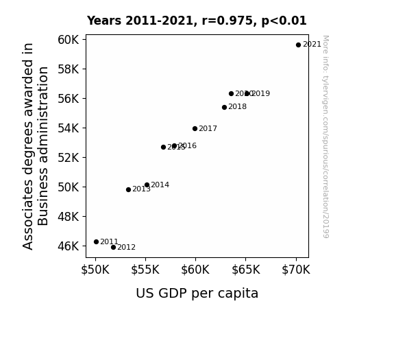 This means 95.1% of the change in the one variable (i.e., US GDP per capita) is predictable based on the change in the other (i.e., Associates degrees awarded in Business administration) over the 11 years from 2011 through 2021.
