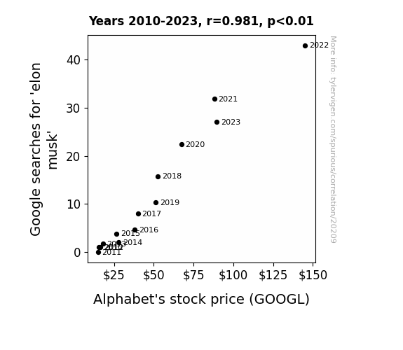 This means 96.2% of the change in the one variable (i.e., Alphabet's stock price (GOOGL)) is predictable based on the change in the other (i.e., Google searches for 'elon musk') over the 14 years from 2010 through 2023.