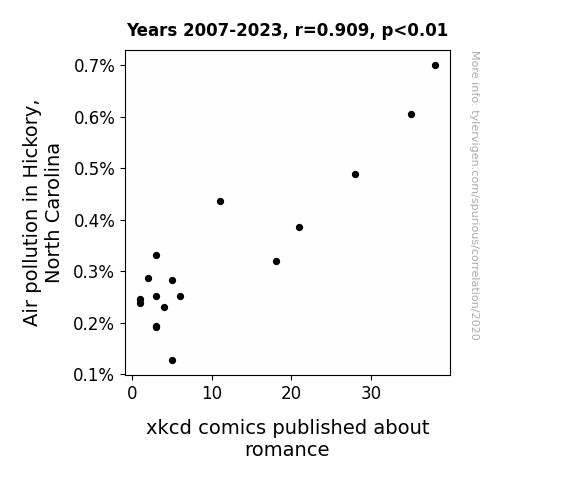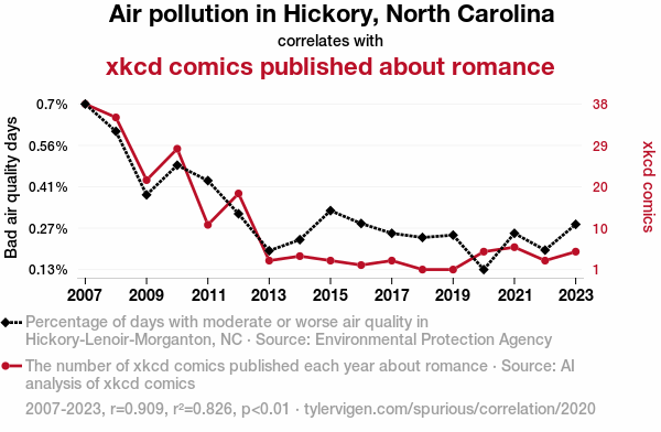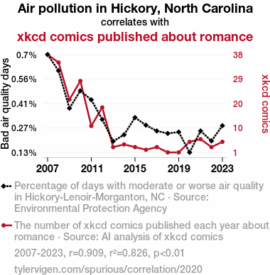 - The spurious research paper: Love is in the Aerosol: A Correlational Study on Air Pollution in Hickory, North Carolina and the Xkcd Comics Romance Index