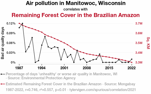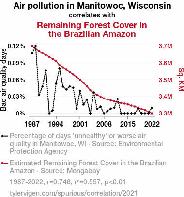 This means 55.7% of the change in the one variable (i.e., Remaining Forest Cover in the Brazilian Amazon) is predictable based on the change in the other (i.e., Air pollution in Manitowoc, Wisconsin) over the 36 years from 1987 through 2022.