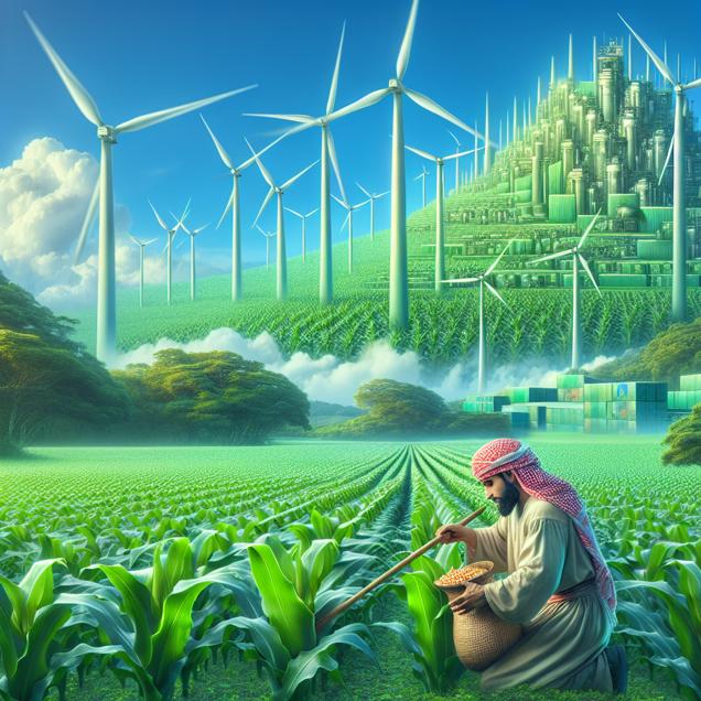 User prompt: Please respond with an image generation prompt that would be likely to create an interesting visual using DALLE-3, using the following style: [ Data cyber art ] and depicting this scene: In a field in South Dakota, a farmer tends to rows of tall, healthy corn plants, some bearing the label "GMO" on their husks. In the background, wind turbines spin gracefully against the clear blue sky of Puerto Rico, generating clean and sustainable energy. Keep the visual depiction simple. Do not include any words or speech bubbles.