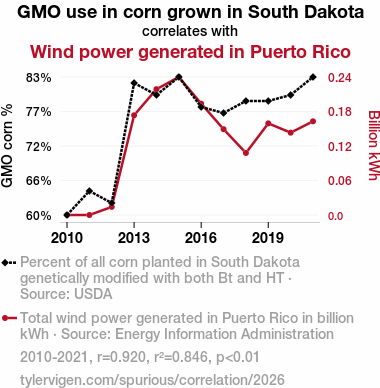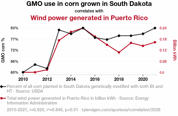 A linear line chart with years as the X-axis and two variables on the Y-axis. The first variable is GMO use in corn grown in South Dakota and the second variable is Wind power generated in Puerto Rico.  The chart goes from 2010 to 2021, and the two variables track closely in value over that time. Small Image