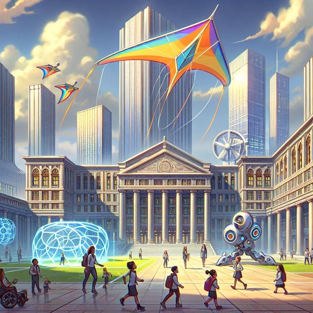 Prompt: Generate an image of a vast, futuristic school courtyard with towering structures stretching into the sky. In the center, children play tag amidst holographic obstacles and robotic companions. A colorful, sleek kite with the name "Athena" gracefully dances in the air, while a futuristic wind turbine hums softly, harnessing the wind to power the advanced cityscape of a bustling town in Honduras. The depiction should include only scenes, people, and objects, it should not include text or speech bubbles.
