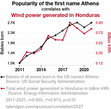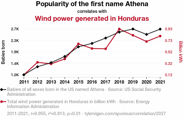 This means 91.3% of the change in the one variable (i.e., Wind power generated in Honduras) is predictable based on the change in the other (i.e., Popularity of the first name Athena) over the 11 years from 2011 through 2021.