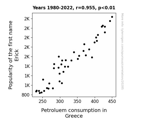 This means 91.2% of the change in the one variable (i.e., Petroluem consumption in Greece) is predictable based on the change in the other (i.e., Popularity of the first name Erick) over the 43 years from 1980 through 2022.