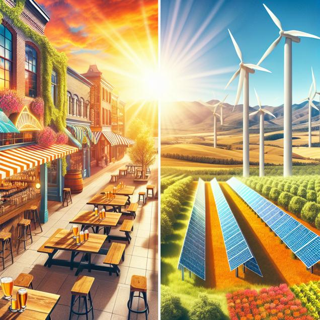 Prompt: Generate an image capturing the contrast between a bustling city in the United States and a serene countryside in South Africa. In the city, vibrant breweries with colorful signs and inviting outdoor seating areas stand proudly, while in the countryside, rows of wind turbines and solar panels generate clean, renewable energy under the bright sun. Ensure the cityscape is vivid and bustling, with prominent brewery signs, while the countryside scene showcases the renewable energy infrastructure against a serene backdrop. The depiction should include only scenes, people, and objects, it should not include text or speech bubbles.