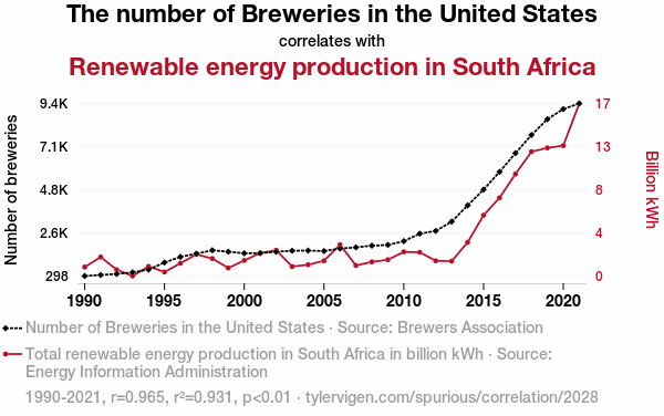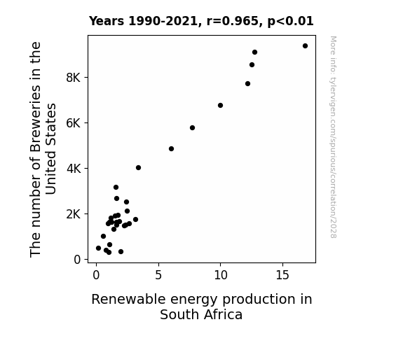 **Figure 1**: The figure below illustrates the remarkable correlation between the number of breweries in the United States and the renewable energy production in South Africa. While we cannot pour a beer for every data point, the strong positive relationship is clear, much like the effervescence in a freshly poured pint of ale.