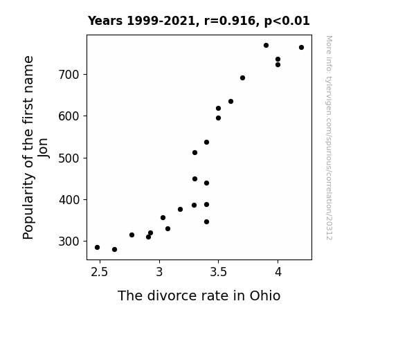 This means 83.9% of the change in the one variable (i.e., The divorce rate in Ohio) is predictable based on the change in the other (i.e., Popularity of the first name Jon) over the 23 years from 1999 through 2021.
