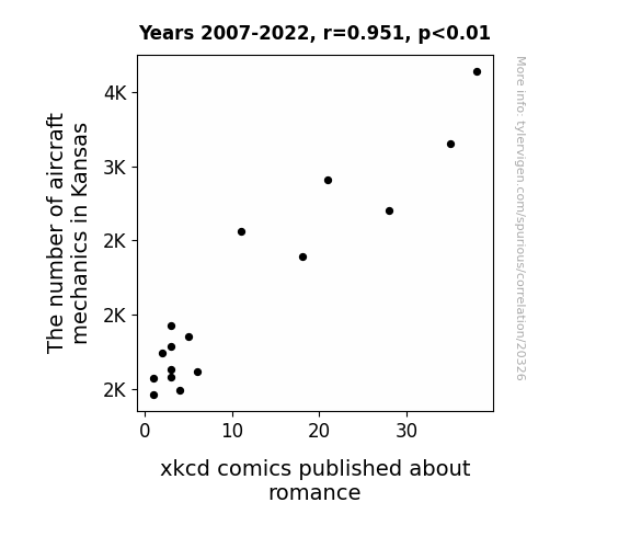 This means 90.4% of the change in the one variable (i.e., xkcd comics published about romance) is predictable based on the change in the other (i.e., The number of aircraft mechanics in Kansas) over the 16 years from 2007 through 2022.