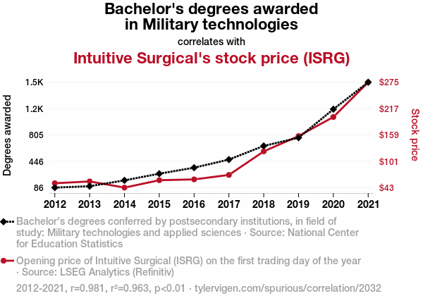 This means 96.3% of the change in the one variable (i.e., Intuitive Surgical's stock price (ISRG)) is predictable based on the change in the other (i.e., Bachelor's degrees awarded in Military technologies) over the 10 years from 2012 through 2021.