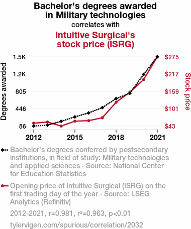 Our study leverages data from the National Center for Education Statistics and LSEG Analytics (Refinitiv) to examine the Bachelor's degrees awarded in military technologies and applied sciences and Intuitive Surgical's stock price from 2012 to 2021. The emergence of a notably high correlation coefficient of 0.9812996 and p < 0.01 between these variables not only raises eyebrows but also beckons researchers to delve into the underlying factors at play. This unexpected revelation prompts us to ponder the synergy between technological education and financial performance. Just as a good surgeon must possess precision and dexterity, could a subtle mastery of military technologies be subtly guiding stock market outcomes? This unexpected correlation invites a deeper exploration of the nuanced influences shaping stock prices, potentially uncovering uncharted pathways for interdisciplinary research.
