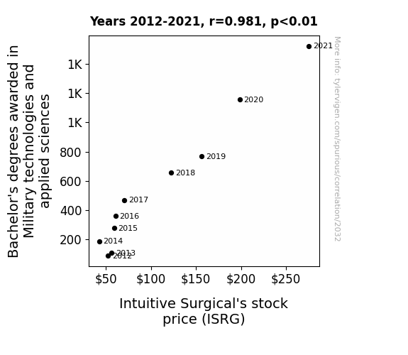 The analysis of the relationship between Bachelor's degrees awarded in military technologies and applied sciences and Intuitive Surgical's stock price (ISRG) from 2012 to 2021 yielded a striking correlation coefficient of 0.9812996, indicating a remarkably strong positive correlation between the two variables. This finding suggests that as the number of Bachelor's degrees awarded in military technologies and applied sciences increases, there is a corresponding tendency for Intuitive Surgical's stock price to rise. It's almost as if a surge in military tech education sends a clear signal to the stock market, saying, "I've got your back!"