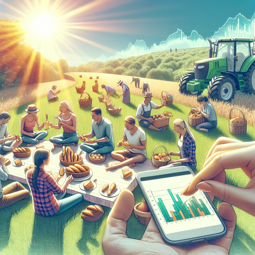 Prompt: Generate an image of a sunlit meadow where a group of people are enjoying a picnic, spreading butter on freshly baked bread. In the background, a farmer uses a John Deere tractor to tend to the fields. Have one of the picnic-goers holding a smartphone showing the Deere & Company's stock price. The overall scene should exude a sense of warmth and relaxation, with an emphasis on the natural beauty of the landscape and the enjoyment of a simple, wholesome meal in the open air. The depiction should include only scenes, people, and objects, it should not include text or speech bubbles.