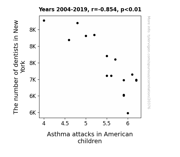 This means 72.9% of the change in the one variable (i.e., Asthma attacks in American children) is predictable based on the change in the other (i.e., The number of dentists in New York) over the 16 years from 2004 through 2019.