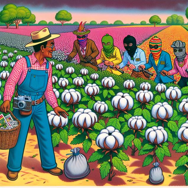 ChatGPT: [Whimsical illustration] Create an image of a Missouri cotton field with a whimsical touch. A farmer in overalls and a straw hat inspects rows of brightly colored, oversized cotton plants bearing quirky patterns, while in the distance, a comically exaggerated group of robbers, each with a different whimsical mask and cartoonish bags of stolen goods, make their escape.