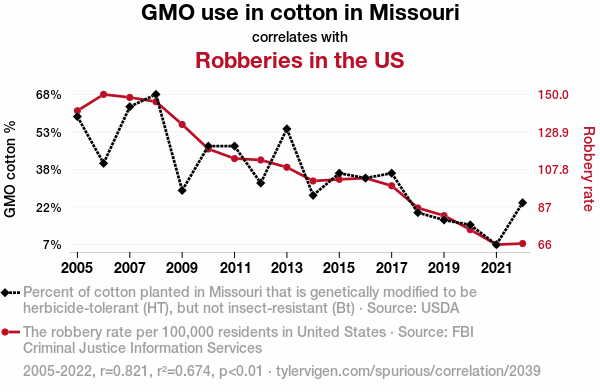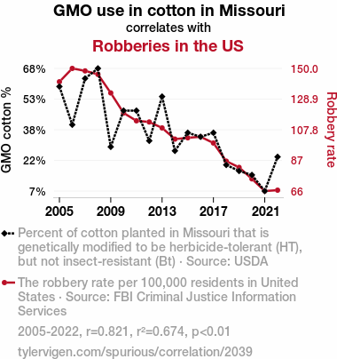 User prompt: Please make up a funny explanation for how a decrease in GMO use in cotton in Missouri caused Robberies to decrease.\Make it sound serious until the end.