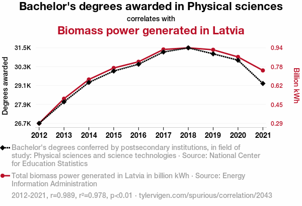 This means 97.8% of the change in the one variable (i.e., Biomass power generated in Latvia) is predictable based on the change in the other (i.e., Bachelor's degrees awarded in Physical sciences) over the 10 years from 2012 through 2021.
