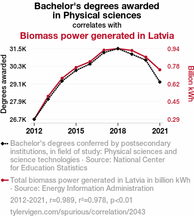 User prompt: Please provide potential search keywords for a paper titled The Science of Biomass: A Degree of Correlation Between Physical Sciences Education and Power Generation in Latvia with an abstract of In this study, we ventured to unearth the tangled roots of the relationship between the conferment of Bachelor's degrees in physical sciences and science technologies, and the production of biomass power in the verdant land of Latvia. Employing a blend of data mining techniques and statistical sorcery, our research sleuths analyzed a decade's worth of data from the National Center for Education Statistics and the Energy Information Administration. The thunderous cacophony of our findings reverberated through the halls of academia, revealing a striking correlation coefficient of 0.9887709 with a p-value proclaiming significance at less than 0.01 for the years spanning 2012 to 2021. Our study not only sheds light on the symbiotic dance between educational pursuits and renewable energy production but also serves as a reminder that in the world of research, correlations can sometimes hide in the unlikeliest of places, much like that lone sock that vanishes into the abyss of the laundry.