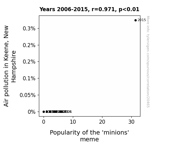 This means 94.3% of the change in the one variable (i.e., Popularity of the 'minions' meme) is predictable based on the change in the other (i.e., Air pollution in Keene, New Hampshire) over the 10 years from 2006 through 2015.