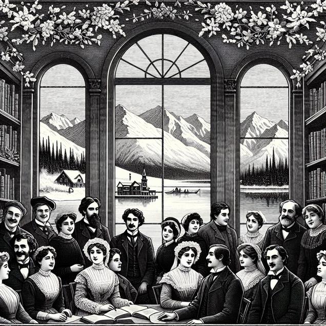 Prompt: Prompt: Generate an image in the style of a black-and-white newspaper illustration depicting a group of individuals gathered in a cozy library near the snow-capped mountains of Alaska. They are celebrating their accomplishment of earning Master's degrees in foreign languages, literatures, and linguistics. The room is filled with joy and scholarly discussions, but a subtle somberness lingers as the topic of the high divorce rate in Alaska is quietly whispered among some attendees. Capture the juxtaposition of academic achievement and personal challenges to create a poignant atmosphere in the room. The visual should evoke a sense of nostalgia and reflection. The depiction should include only scenes, people, and objects, it should not include text or speech bubbles.
