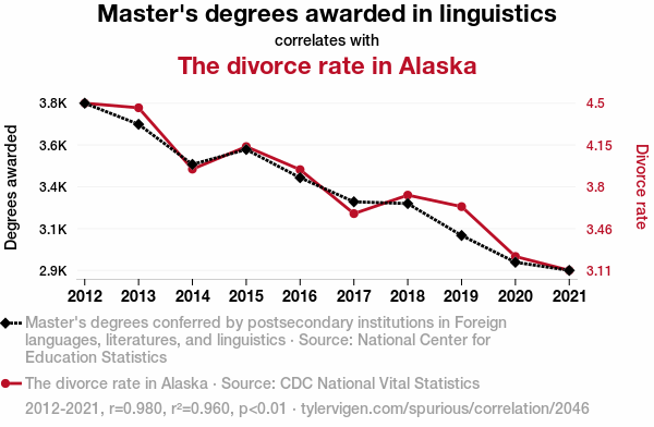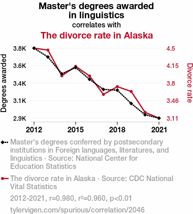 - The spurious research paper: Lost in Translation: Unraveling the Relationship Between Master's Degrees in Foreign Languages, Literatures, and Linguistics and the Divorce Rate in Alaska