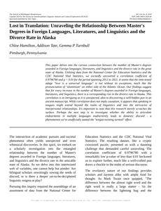 User prompt: Please provide potential search keywords for a paper titled Lost in Translation: Unraveling the Relationship Between Master's Degrees in Foreign Languages, Literatures, and Linguistics and the Divorce Rate in Alaska with an abstract of This paper delves into the curious connection between the number of Master's degrees awarded in Foreign languages, literatures, and linguistics and the divorce rate in the great state of Alaska. Utilizing data from the National Center for Education Statistics and the CDC National Vital Statistics, we excitedly uncovered a correlation coefficient of 0.9796780 and p < 0.01 for the period spanning 2012 to 2021. It seems that the time-tested adage "love is a universal language" is not without its exceptions, much like the pronunciation of "aluminium" on either side of the Atlantic Ocean.