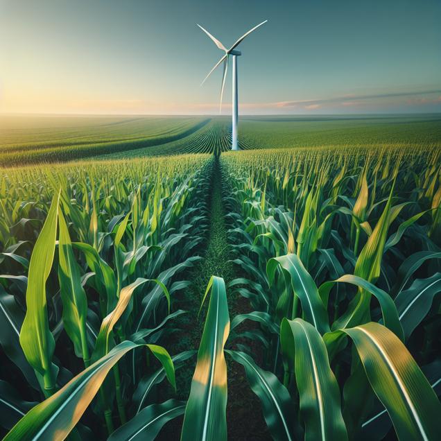 User prompt: Please respond with an image generation prompt that would be likely to create an interesting visual using DALLE-3, using the following style: [ A TIME magazine cover image ] and depicting this scene: In a vast cornfield in Indiana, tall green stalks of genetically modified corn sway gently in the breeze. In the background, a modern wind turbine stands tall, generating electricity for the island of Saint Kitts and Nevis. Keep the visual depiction simple. Do not include any words or speech bubbles.