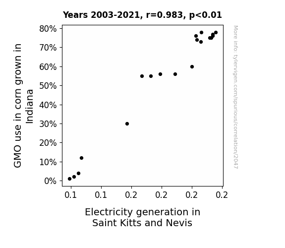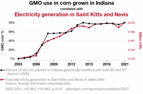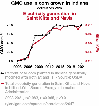 Fig. 1 illustrates this eye-popping correlation with a scatterplot that demonstrates the striking coherence between GMO corn use in Indiana and electricity generation in Saint Kitts and Nevis. The data points practically leap off the page, leaving no doubt that there is a kernel-currant connection at play.