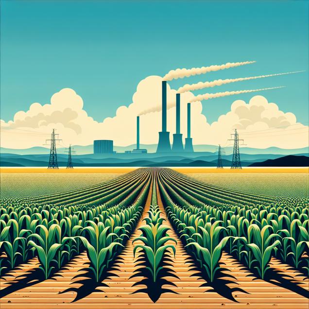 ChatGPT: In a cornfield in Illinois, rows of genetically modified corn stretch towards the horizon, their vibrant green stalks swaying in the breeze. In the background, steam rises from a cluster of geothermal power plants in Iceland, harnessing the Earth's natural heat to produce renewable energy.