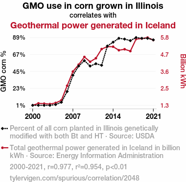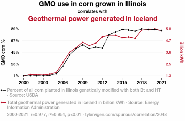 This means 95.4% of the change in the one variable (i.e., Geothermal power generated in Iceland) is predictable based on the change in the other (i.e., GMO use in corn grown in Illinois) over the 22 years from 2000 through 2021.